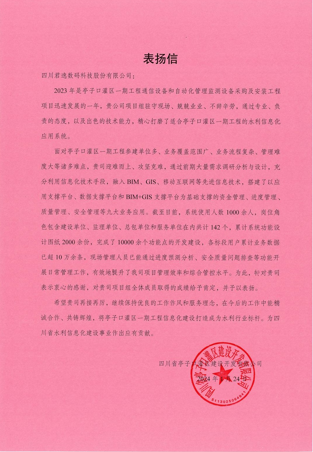 近日,四川省亭子口灌區(qū)建設(shè)開發(fā)有限公司(以下簡稱亭子口灌區(qū)公司)向君逸數(shù)碼發(fā)來感謝信。對君逸數(shù)碼為亭子口灌區(qū)一期工程打造的高標準、高穩(wěn)定性水利信息化應(yīng)用系統(tǒng)表示衷心的感謝。為此,特發(fā)表揚信以感謝君逸數(shù)碼項目組全體成員的專業(yè)技術(shù)能力和良好服務(wù)理念。2023年是亭子口灌區(qū)一期工程通信設(shè)備和自動化管理監(jiān)測設(shè)備采購及安裝工程項目迅速發(fā)展的一年,君逸數(shù)碼項目團隊兢兢業(yè)業(yè)、攻堅克難、勇于擔責,成功保障了項目的順利實施。