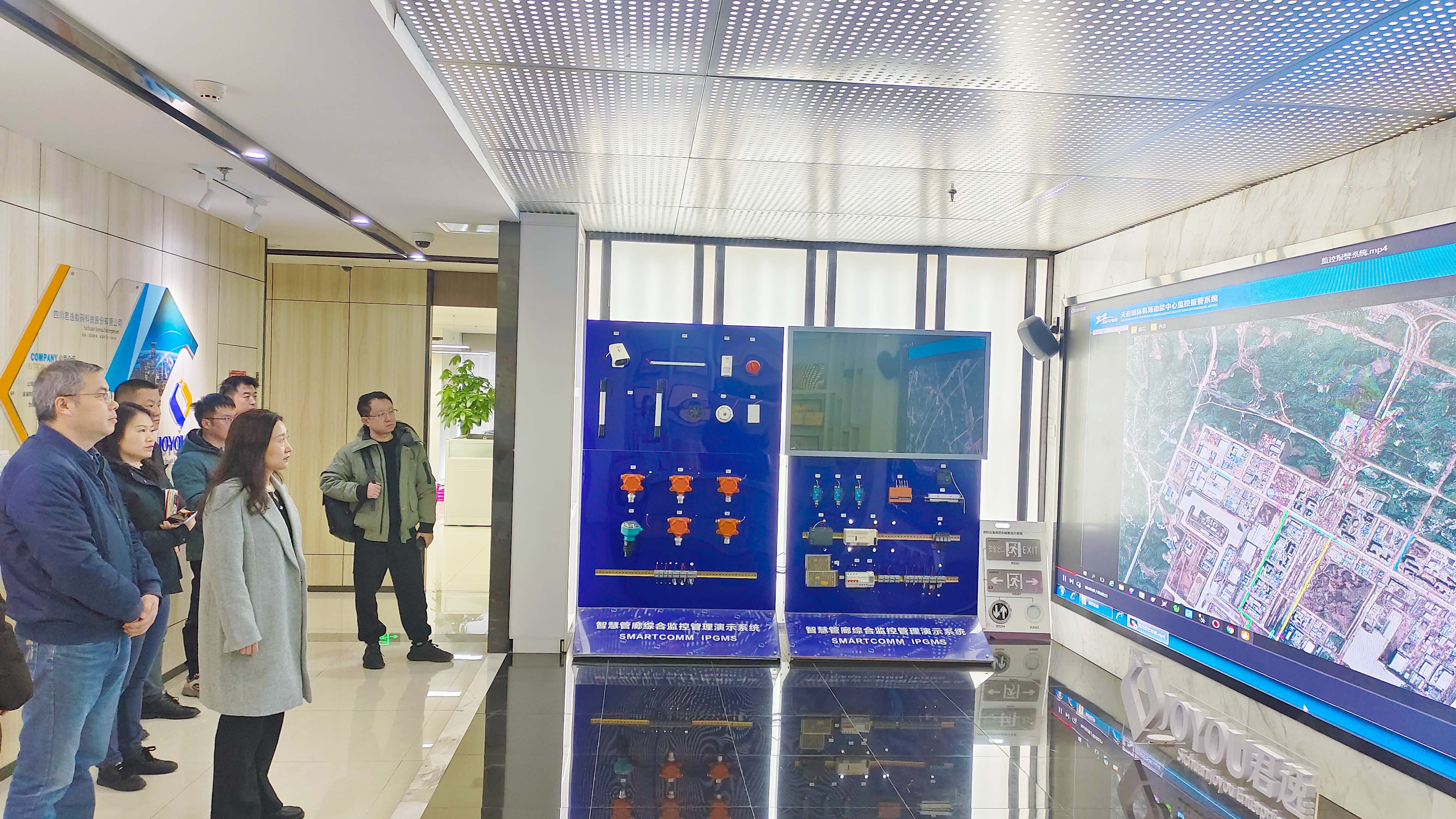 會前,丁琴領(lǐng)導一行首先參觀了君逸數(shù)碼數(shù)字展廳,了解君逸數(shù)碼打造的住建部科技示范項目-成都地下綜合管廊總控中心項目及天府國際機場智慧管廊項目,在現(xiàn)場觀看技術(shù)工作人員的實操演示。并就相關(guān)技術(shù)問題進行了詢問、了解。