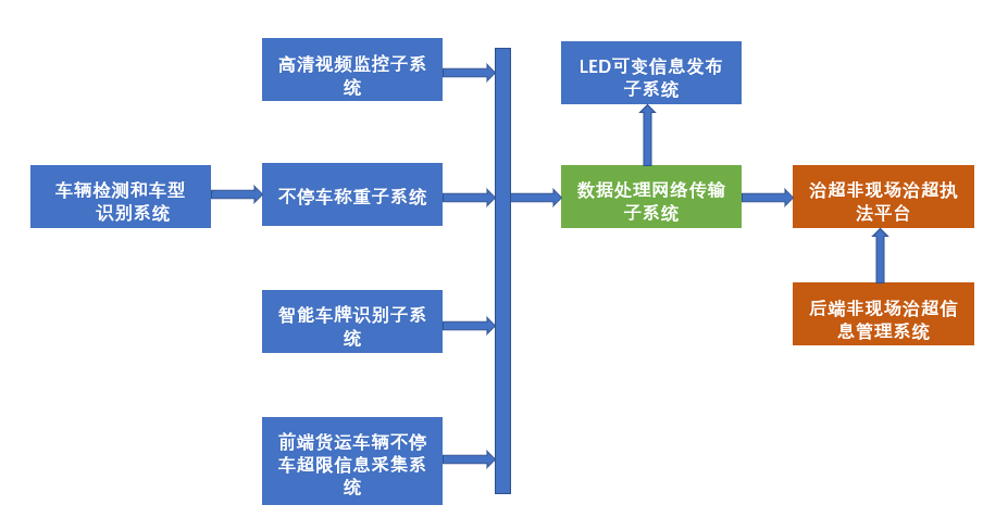 非現(xiàn)場(chǎng)執(zhí)法的治超系統(tǒng)是將不停車動(dòng)態(tài)稱重、視頻監(jiān)控、圖像抓拍及車牌識(shí)別、信息提示系統(tǒng)的有機(jī)集成,建立起一個(gè)全天候貨運(yùn)車輛超載違法行為監(jiān)控系統(tǒng)。非現(xiàn)場(chǎng)執(zhí)法的治超系統(tǒng)由前端貨運(yùn)車輛超限信息采集系統(tǒng)、車牌識(shí)別子系統(tǒng)、不停車稱重子系統(tǒng)、視頻監(jiān)控子系統(tǒng)、數(shù)據(jù)傳輸子系統(tǒng)、信息發(fā)布子系統(tǒng)和后端超限信息管理與非現(xiàn)場(chǎng)執(zhí)法平臺(tái)組成。對(duì)貨運(yùn)車輛超載行為實(shí)施有效檢測(cè)和監(jiān)控,為交通管理部門提供治超執(zhí)法依據(jù)。