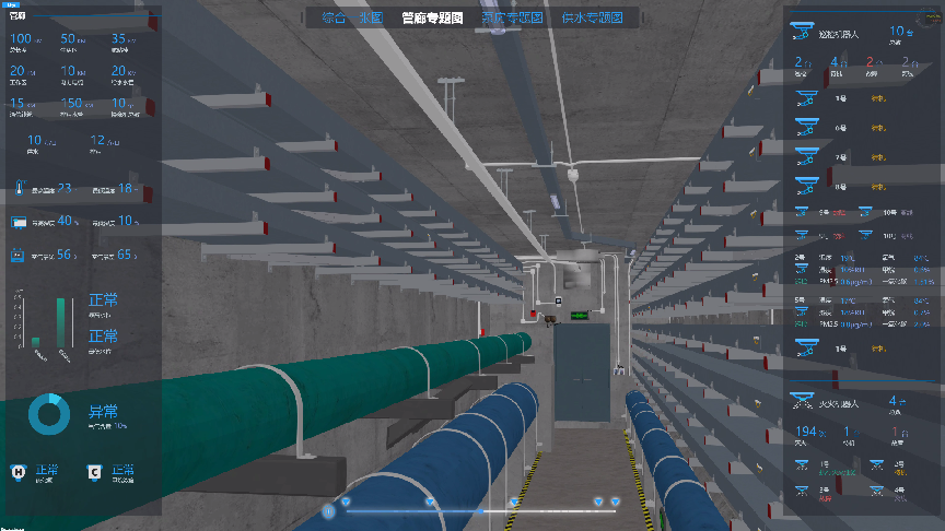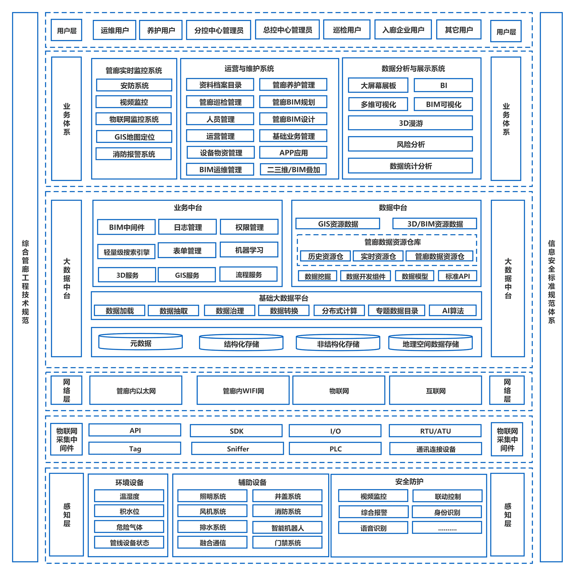地下綜合管廊是指在城市地下建造一個隧道空間,將電力、通訊、燃氣、供熱、給排水等各種工程管線集于一體,實施統(tǒng)一規(guī)劃、建設,以形成一種集約化、可持續(xù)性的管線敷設方式,是韌性城市建設的重要組成部分。地下綜合管廊包含多種智能化系統(tǒng),其結構復雜,需要統(tǒng)一的集成管理,通過建設地下綜合管廊管理平臺實現(xiàn)各系統(tǒng)統(tǒng)一管理、信息共享及聯(lián)動控制。根據(jù)國標《城市綜合管廊工程技術規(guī)范》(GB50838)要求,建設地理信息系統(tǒng)和統(tǒng)一管控平臺,綜合管廊的建設應向智慧化方向發(fā)展,通過結合BIM、物聯(lián)網(wǎng)、大數(shù)據(jù)技術,建設智慧管控一張圖,智慧運營服務、智慧應急、大數(shù)據(jù)分析等系統(tǒng)平臺,覆蓋綜合管廊項目全生命周期,實現(xiàn)綜合管廊規(guī)劃、建設、運行、維護及管理、服務的智慧化,保障綜合管廊全生命周期的安全、高效、智能、綠色,從而提升城市基礎設施功能和城市運行能力。
