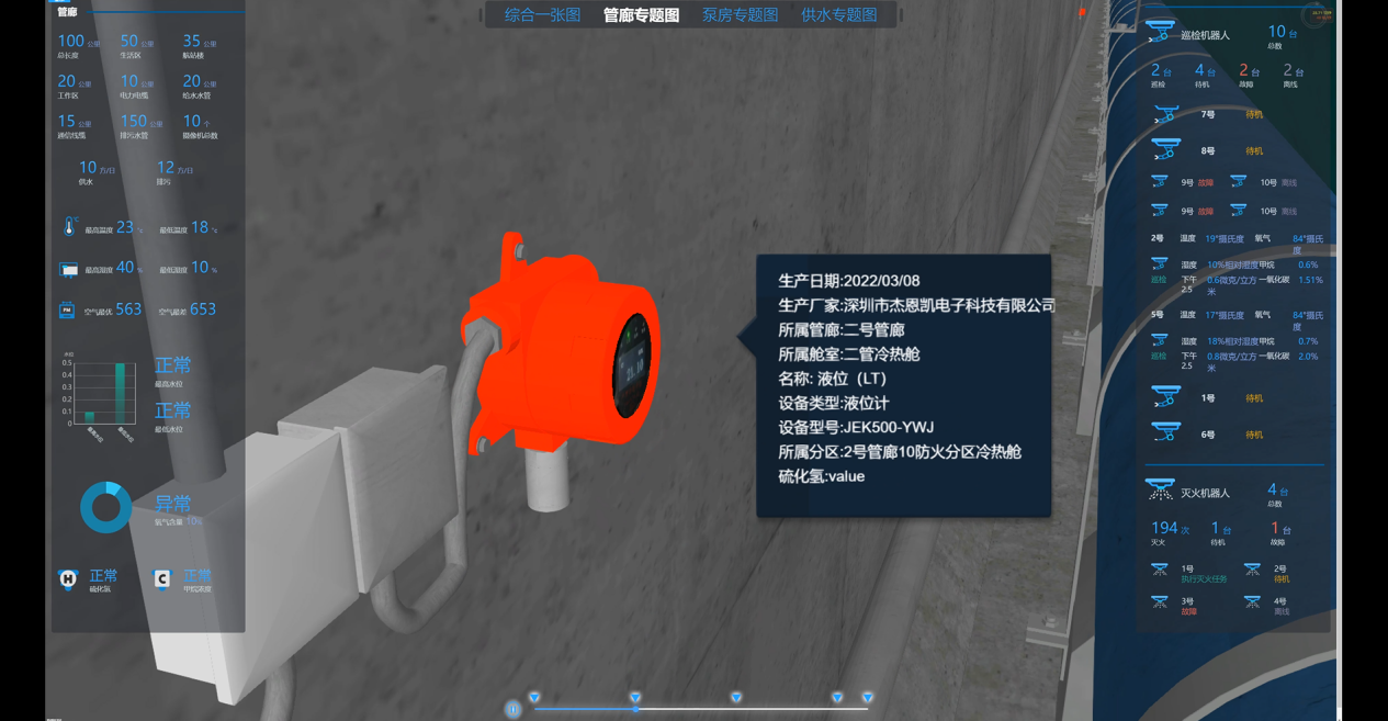結(jié)合動態(tài)時空變化數(shù)據(jù)(比如:人員和設備移動、管廊照明、能源傳輸、災害擴散等),展示智慧管廊模型場景的動效效果,使得管廊中的重要事件、關(guān)鍵元素更加突出,三維地圖展示具有實時動態(tài)感,成為智慧管廊數(shù)字孿生的夯實底座。