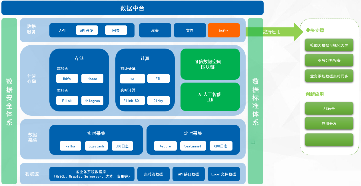 數(shù)據(jù)中臺(tái)是學(xué)校內(nèi)外部多源數(shù)據(jù)進(jìn)行統(tǒng)一采集、治理、建模、服務(wù)化的綜合平臺(tái),形成可持續(xù)復(fù)用數(shù)據(jù)資源的機(jī)制。其本質(zhì)是“數(shù)據(jù)倉(cāng)庫(kù)+數(shù)據(jù)服務(wù)中間件”,強(qiáng)調(diào)數(shù)據(jù)的業(yè)務(wù)價(jià)值轉(zhuǎn)化,而非僅存儲(chǔ)管理。